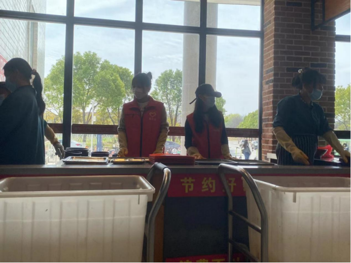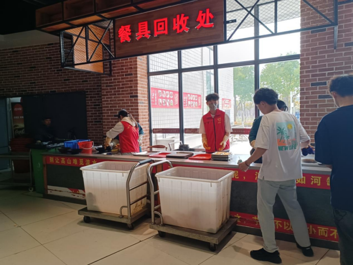 pg娱乐官网青年志愿者协会参与成员统一服装维持就餐秩序,各个小组分工明确,协助食堂清洁阿姨对餐桌上的残留物进行清理,在餐具回收处协助工作人员回收餐具并进行分类。