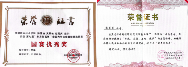 获奖情况:“河南省优秀共青团员”“河南省优秀学生干部” “信阳市优秀共青团员” “魅力团支书” “三好学生”“优秀共青团干部”“社会实践先进个人”等