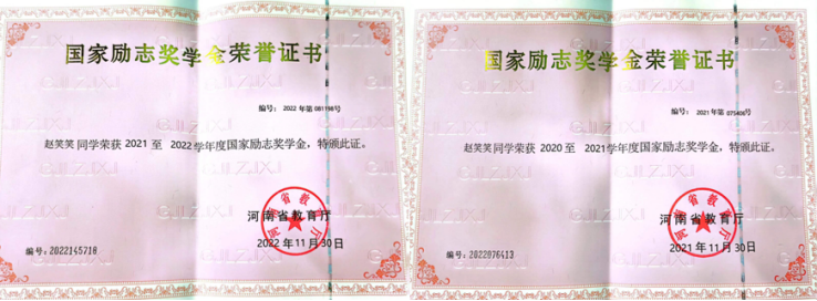 获奖情况:国家奖学金、河南省优秀学生干部、国家励志奖学金、青年志愿服务先进个人等