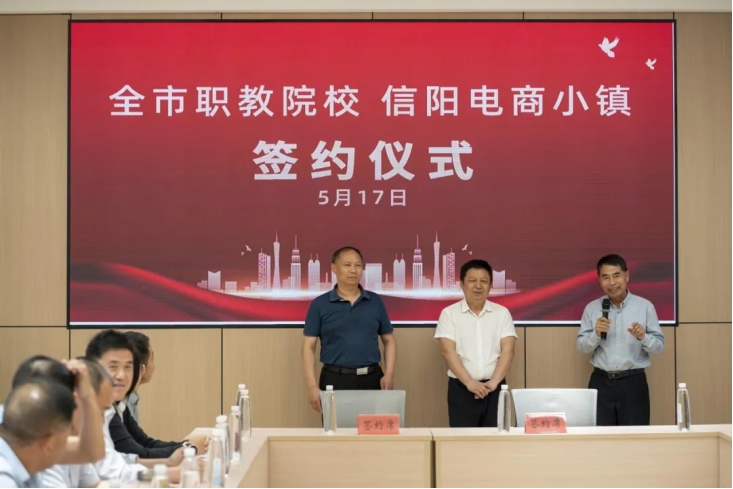 邱业帅主任介绍了电商小镇建设背景及发展现状。邱学明镇长明确电商小镇定位,同时肯定高校参与电商小镇的建设和发展的深远意义。此次活动为信阳市职业教育与地方企业发展搭建一个稳固的合作框架,同时,也为学生提供丰富的实践机会,通过签订合作协议,实现教育资源与企业需求的有效对接。