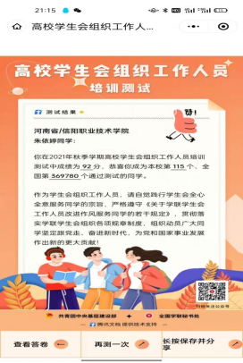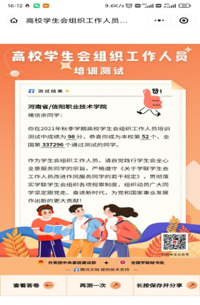 为了进一步强化学生干部职责,明确学生干部要全心全意为同学服务的宗旨,更加了解中华全国学联的价值。pg娱乐电子游戏官网入口团总支于2021年11月9日夜晚召集所有学生干部开展关于“坚定跟党走,奋进新时代”的培训测试答题活动。