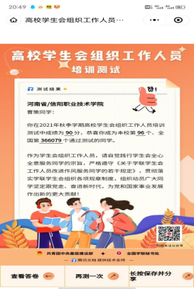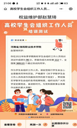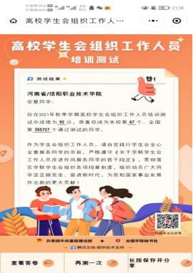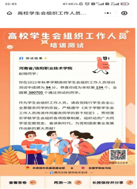 这次培训测试活动不仅使同学们更加深刻地了解到自己的工作内容,作为一名学生干部需要全心全意为同学服务,更要有为党和国家事业出一份力的责任心,这为我们在校园中更好的成长指明了方向。