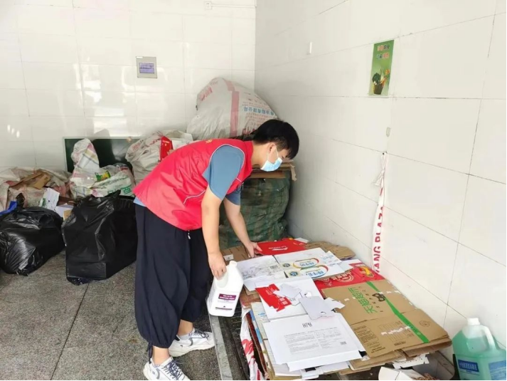 图为 在为社区废品回收进行垃圾分类整理摆放 王锦蒲